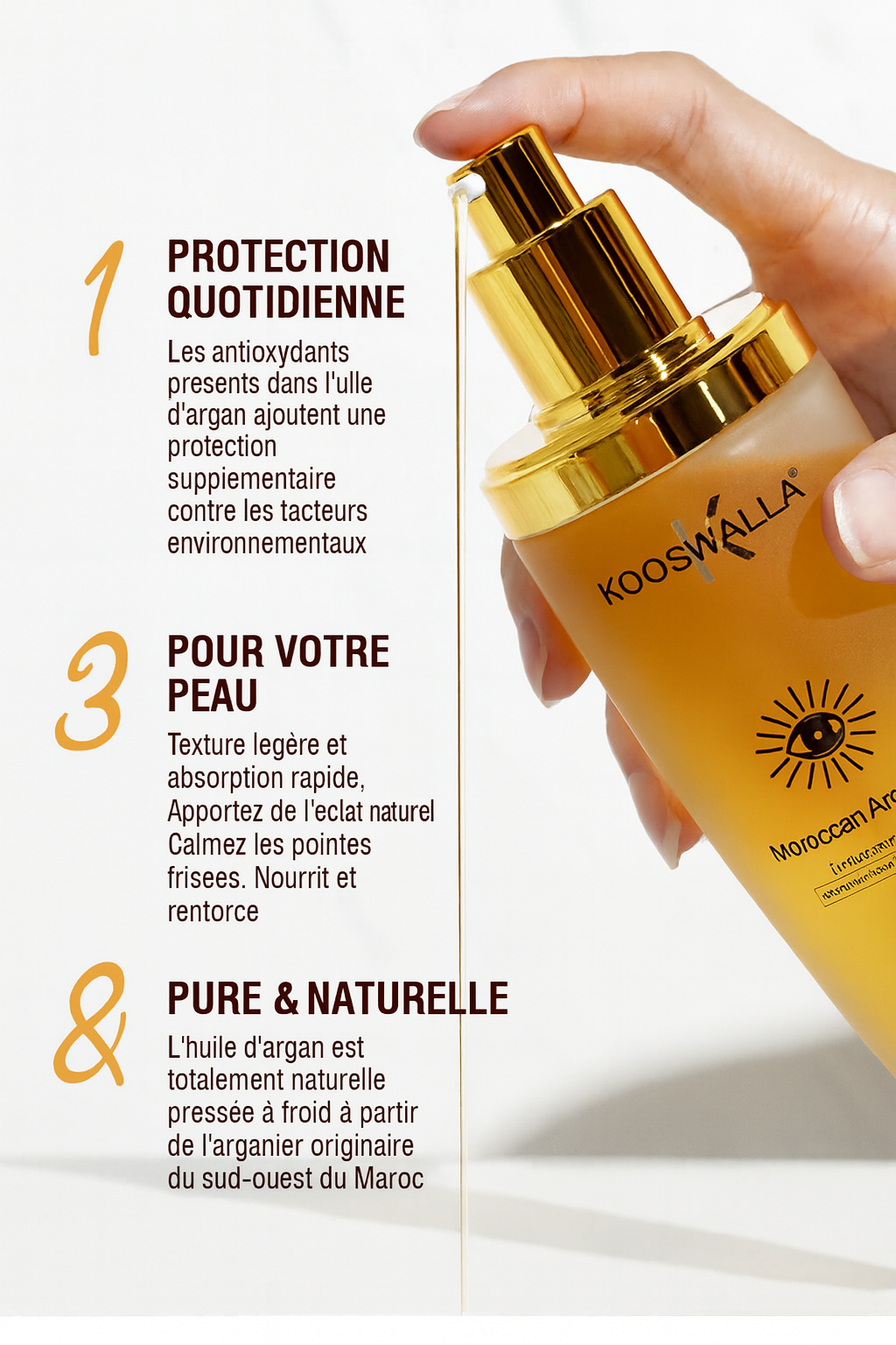 Offrez à vos cheveux un soin d’exception avec l’Huile d’Argan Pure & Bio « KooSwalla », une solution professionnelle dédiée à la réparation, à la nutrition et à l’éclat des cheveux.